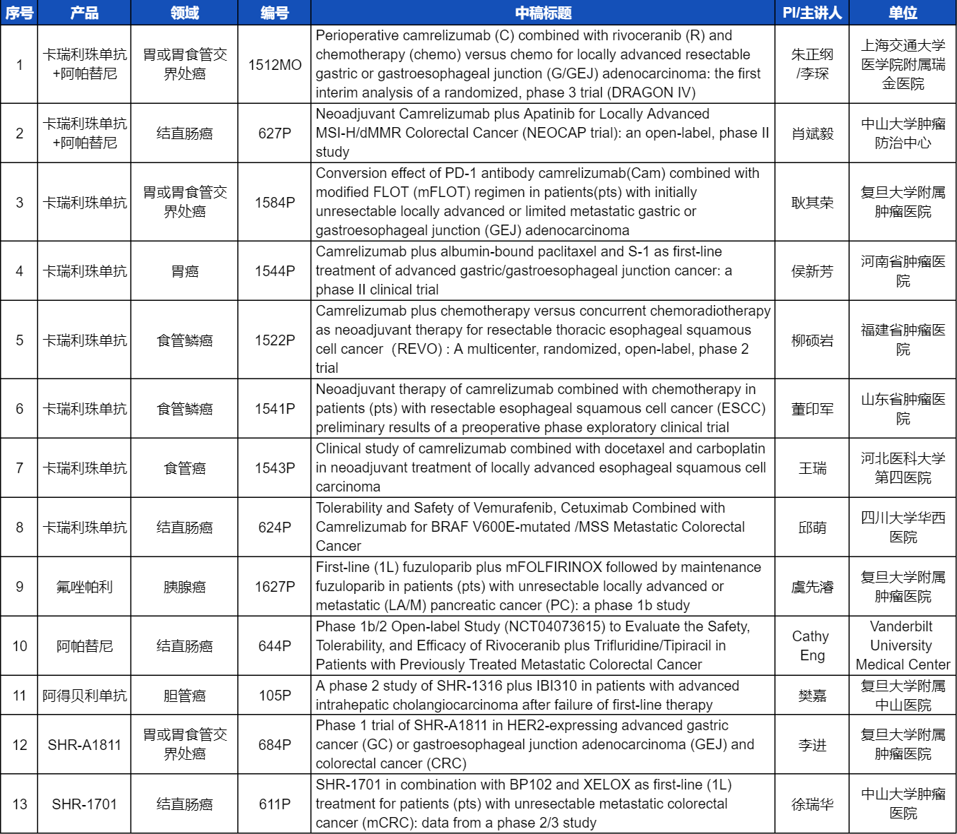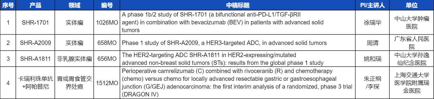 本次ESMO大会,将由中山大学肿瘤医院徐瑞华教授、广东省人民医院周清教授、中山大学孙逸仙纪念医院姚和瑞教授、上海交通大学医学院附属瑞金医院李琛教授分别就4项利来医药创新产品相关研究做口头报告,包括SHR-1701、SHR-A2009、SHR-A1811这3款未上市创新产品的实体瘤治疗临床研究,以及1项“双艾”组合(卡瑞利珠单抗联合阿帕替尼)治疗局部晚期可切除胃/胃食管交界处癌的Ⅲ期临床试验期中分析。