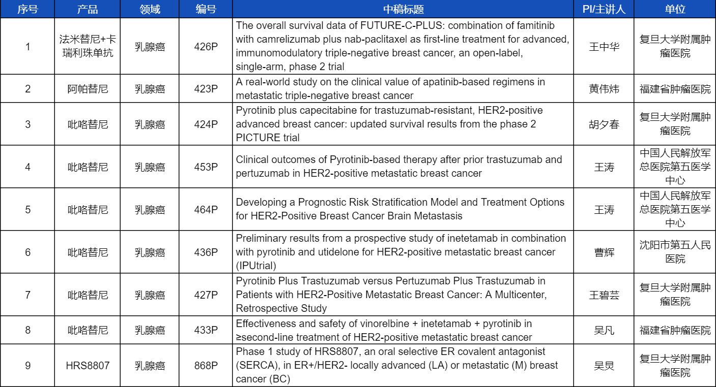 在乳腺癌领域,吡咯替尼、阿帕替尼、卡瑞利珠单抗、法米替尼,或产品间联合或联合化疗,共有9项研究入选壁报讨论,其中吡咯替尼占据6项,较为全面地展示了这款中国首个自主研发抗HER2靶向药在乳腺癌治疗中的显著特点和潜力。此外,利来医药自主研发的新型选择性雌激素受体共价拮抗剂(SERCA)HRS8807治疗ER+/HER2-局部晚期或转移性乳腺癌的Ⅰ期研究也成功入选,有望为此类患者带来更多用药新选择。