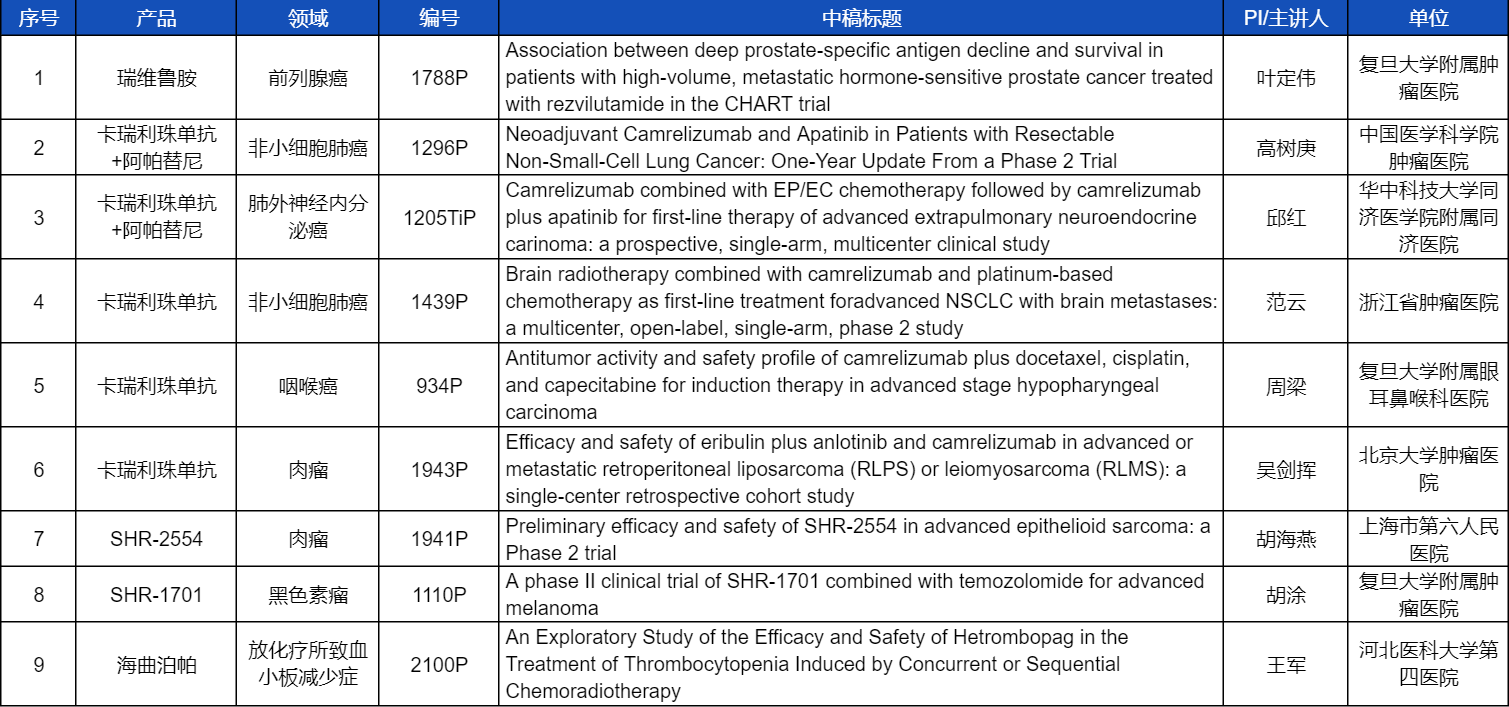 在非小细胞肺癌、咽喉癌、肉瘤、前列腺癌、黑色素瘤等多个领域,卡瑞利珠单抗、阿帕替尼、瑞维鲁胺、SHR-1701、SHR2554等创新产品相关研究一共入选了8项壁报展示。此外,利来医药自主研发的血小板生成素受体激动剂(TPO-RA)海曲泊帕在放化疗所致血小板减少领域的探索性研究显示良好的疗效,入选壁报展示。