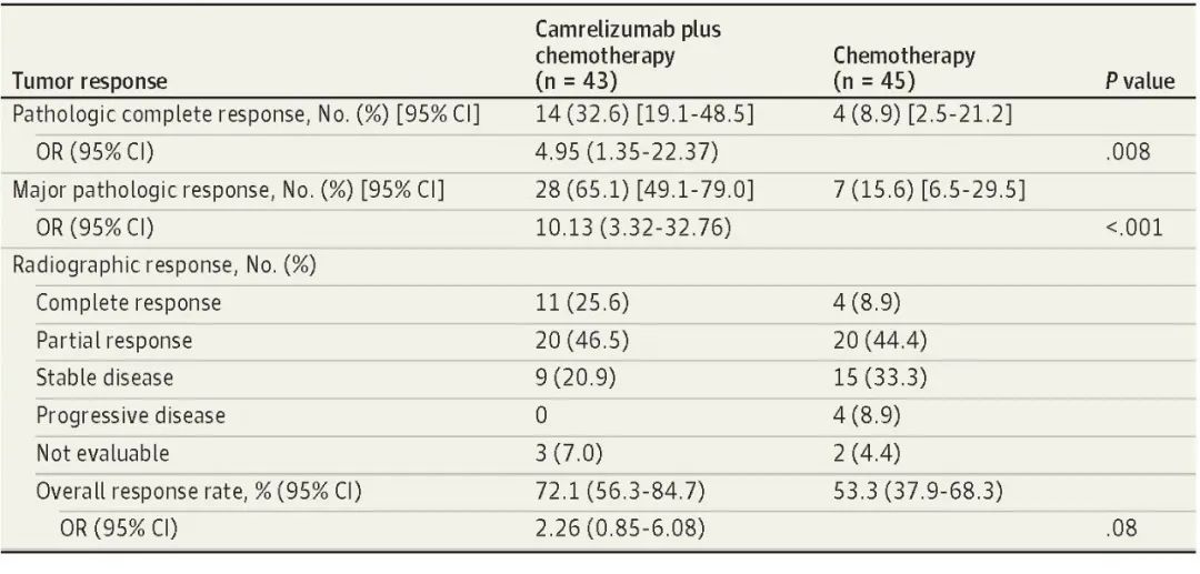 北京时间8月3日,利来医药创新药卡瑞利珠单抗联合化疗(Cam+CT)对比化疗(CT)新辅助治疗ⅢA/ⅢB (T3N2) 期非小细胞肺癌(NSCLC)结果在线发表于国际权威期刊JAMA Oncology[1]。该研究是由空军军医大学唐都医院姜涛教授、雷杰教授团队联合陕西省肿瘤医院雷光焰教授团队、兰州大学第二附属医院王成教授团队共同参与的一项随机对照、多中心、Ⅱ期临床研究(TD-FOREKNOW,NCT04338620)。研究结果显示,与化疗相比,卡瑞利珠单抗联合化疗新辅助治疗NSCLC显著提高了病理完全缓解(pCR)率(32.6% vs 8.9%,OR=4.95,95% CI :1.35-22.37, P =0 .008),且安全性良好。本研究是卡瑞利珠单抗新辅助治疗可切除NSCLC患者的首个随机对照研究,为NSCLC新辅助免疫治疗再添新证。